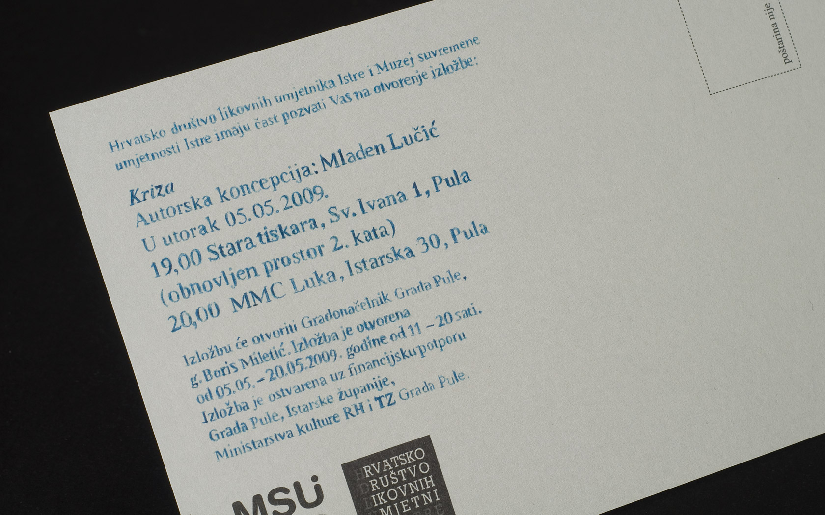 Za izložbu ‘Kriza’, u organizaciji Hrvatskog društva likovnih umjetnika Istre i Muzeja suvremene umjetnosti Istre, dizajnirali smo plakate i pozivnice. Na izložbi su bili izloženi radovi 55 hrvatskih umjetnika od 1960. do danas.